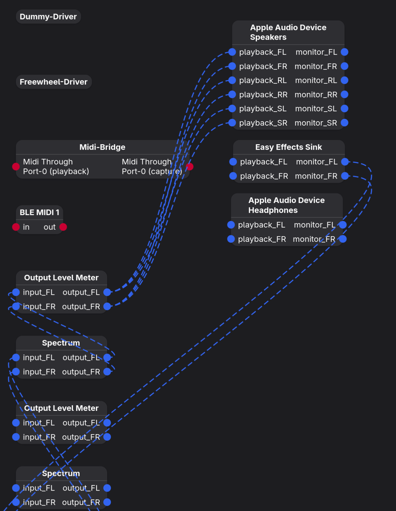 I connected FL and FR to correspoinding all playbacks. Also, be careful of Apple Audio Device Headphones node. It is hiding behind the Apple Audio Device Speakers node. If you wrongly connect to the Headphone's playback, a strange big sound will be heard.